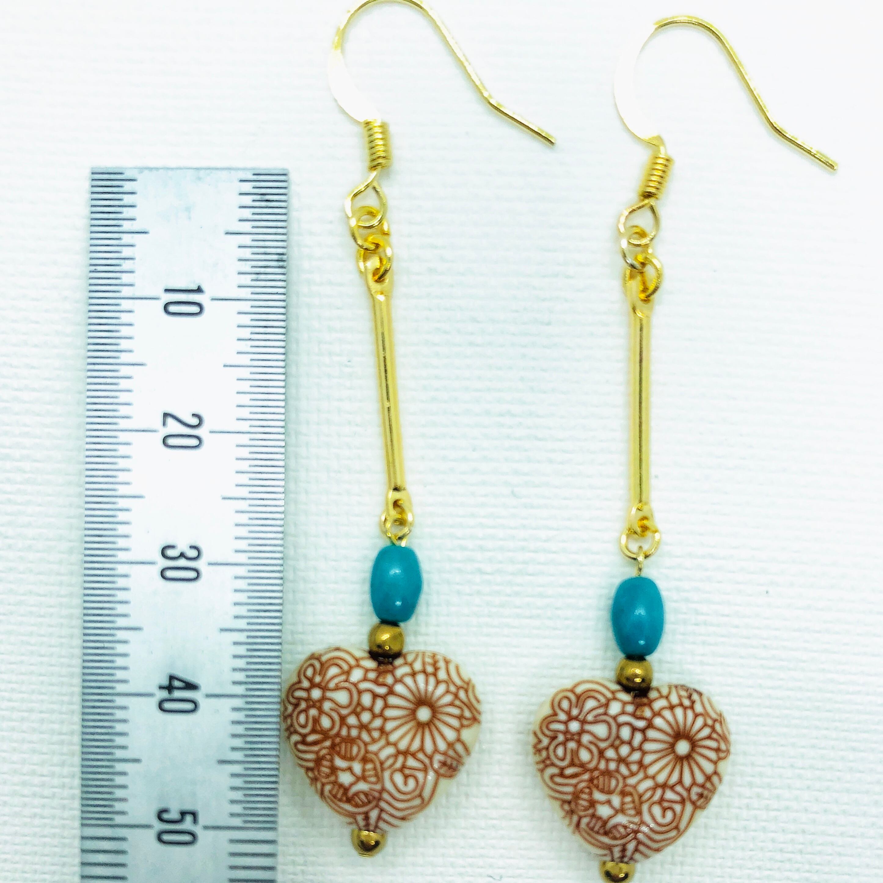 個性的なブラウンの柄入りハートにターコイズカラーのビーズを合わせました。