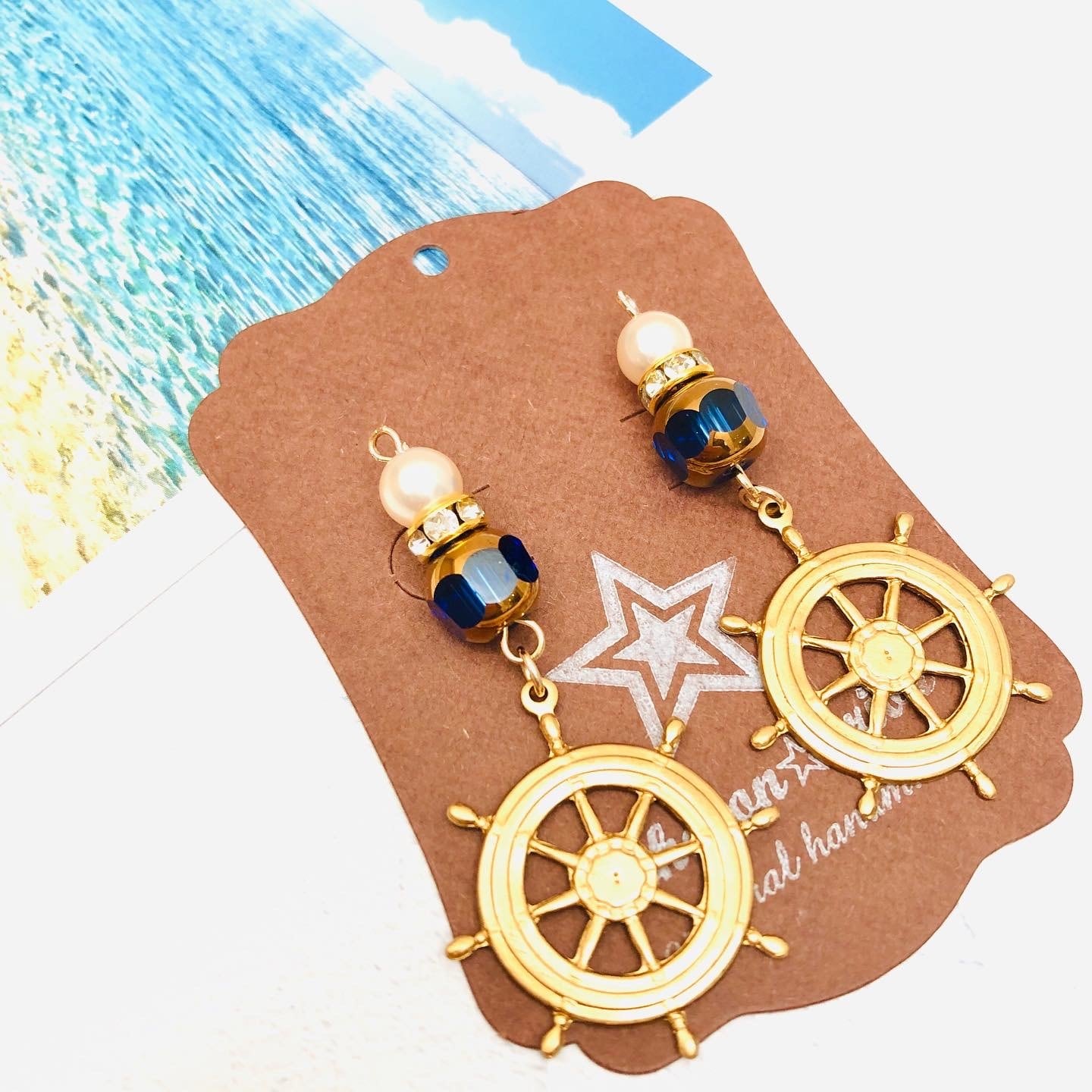 ゴールドのラダー(舵)や貝殻がカッコイイ夏っぽいマリンアクセサリー。