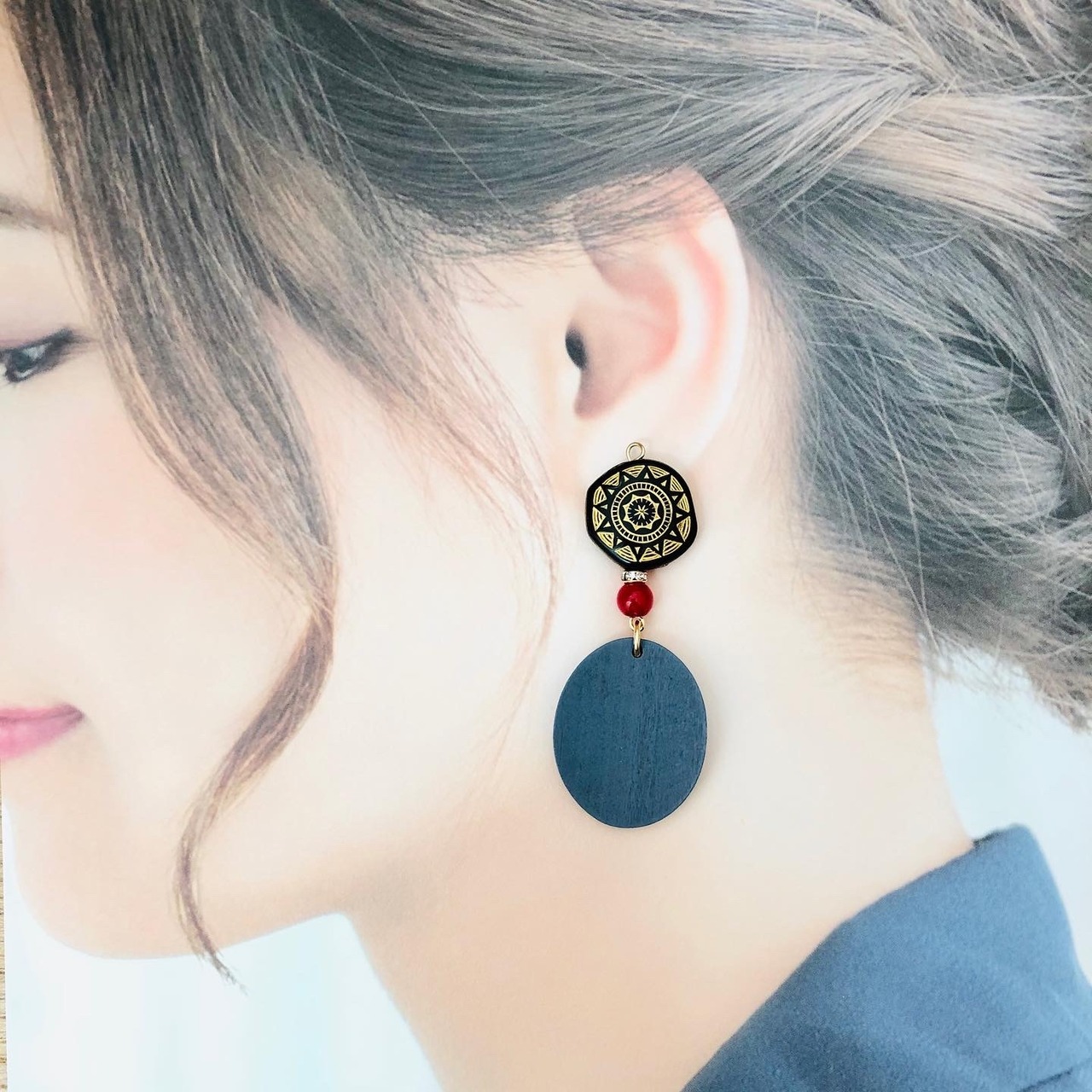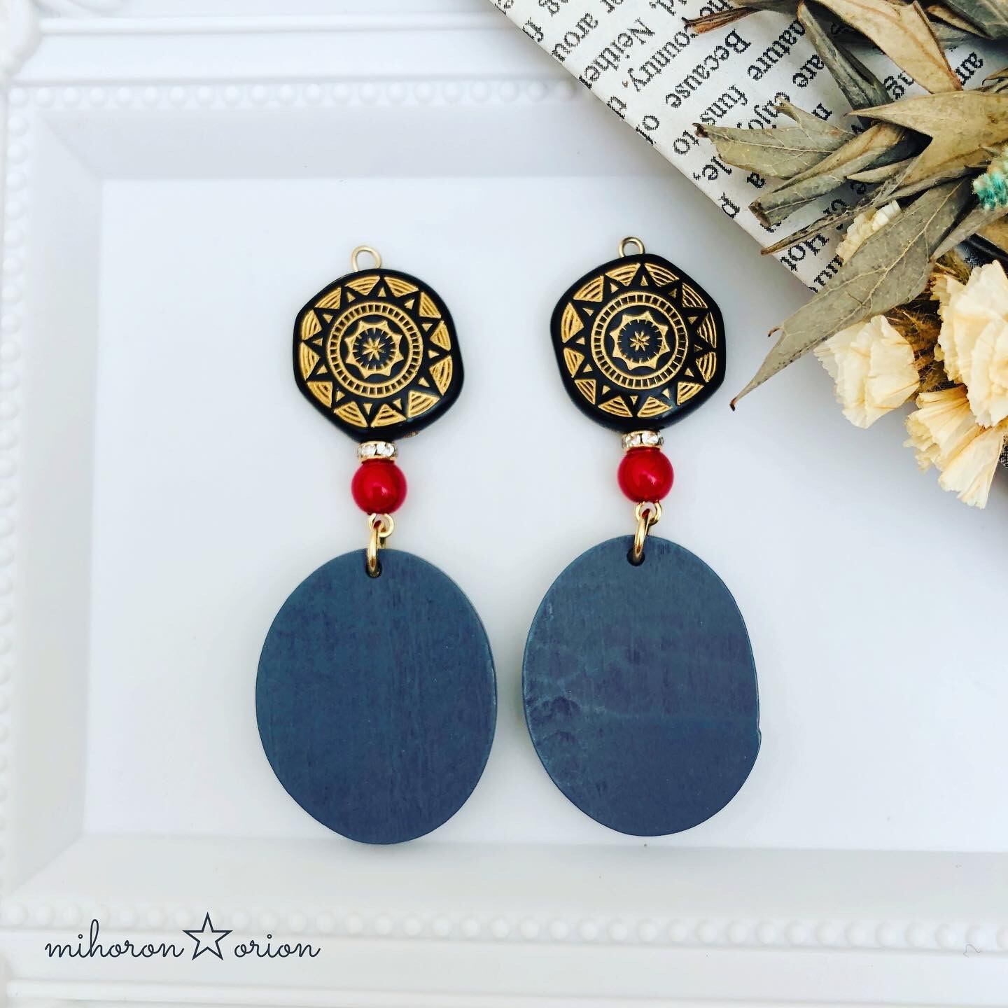 大ぶりな楕円形ウッドチャーム×ゴールド模様の黒のアクリビーズ。