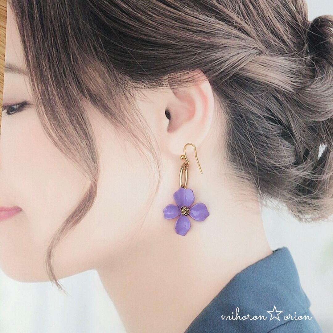 夏っぽいパステルカラーの花のアクセサリーはゴールドのオーバル型パーツで長さを出して揺れを強調しました。