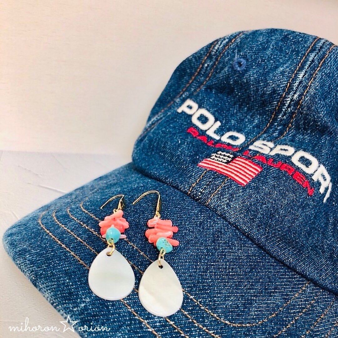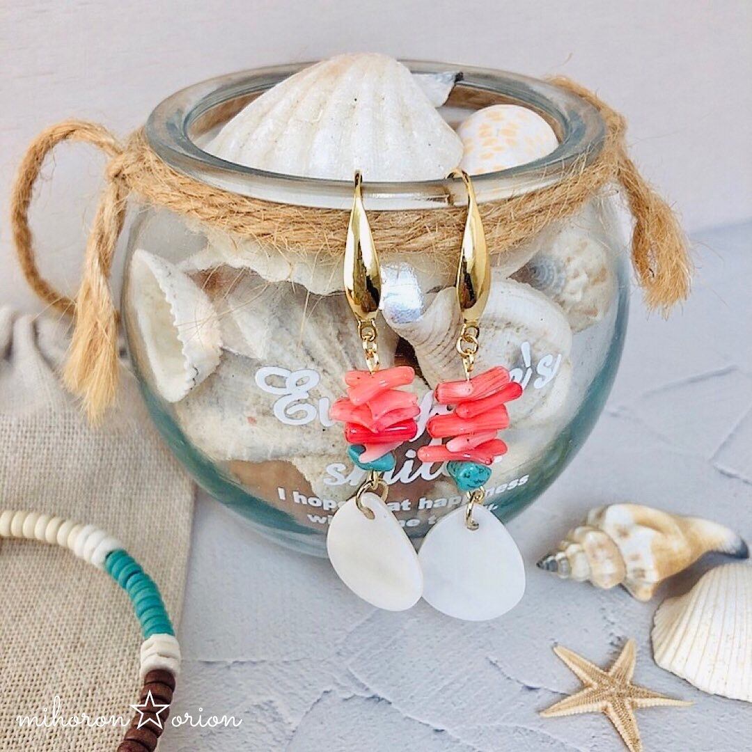 珊瑚カラーに染めた細石とターコイズカラーの細石をしずく型シェルと合わせました☆