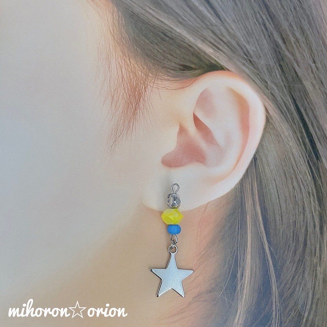 シルバー・イエロー・ブルーのそれぞれ形が違う3色のビーズにシルバーの星を合わせました☆