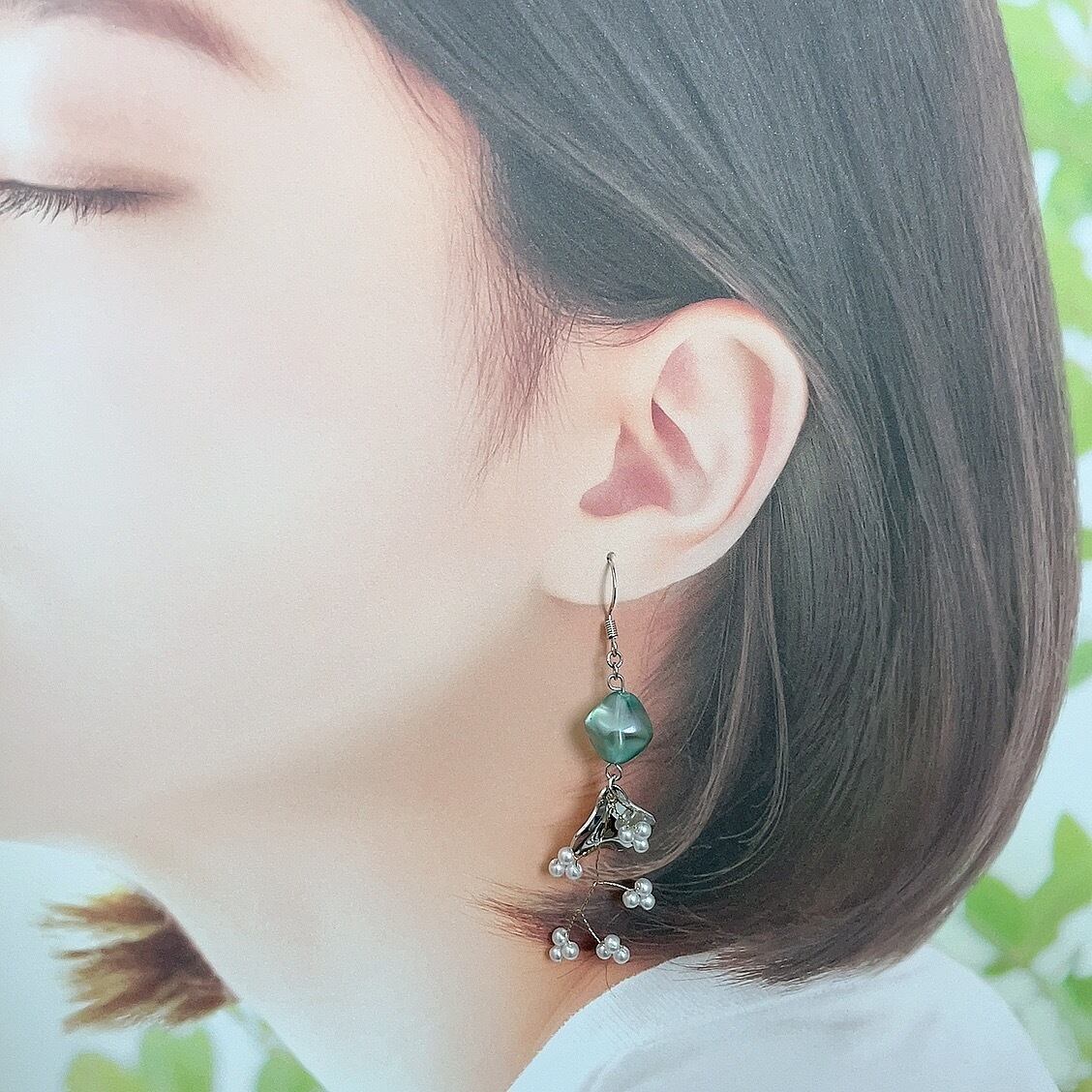 ミントグリーンのビーズに合わせたシルバーリーフやパールフラワーが華やかでブーケみたいなアクセサリー♡