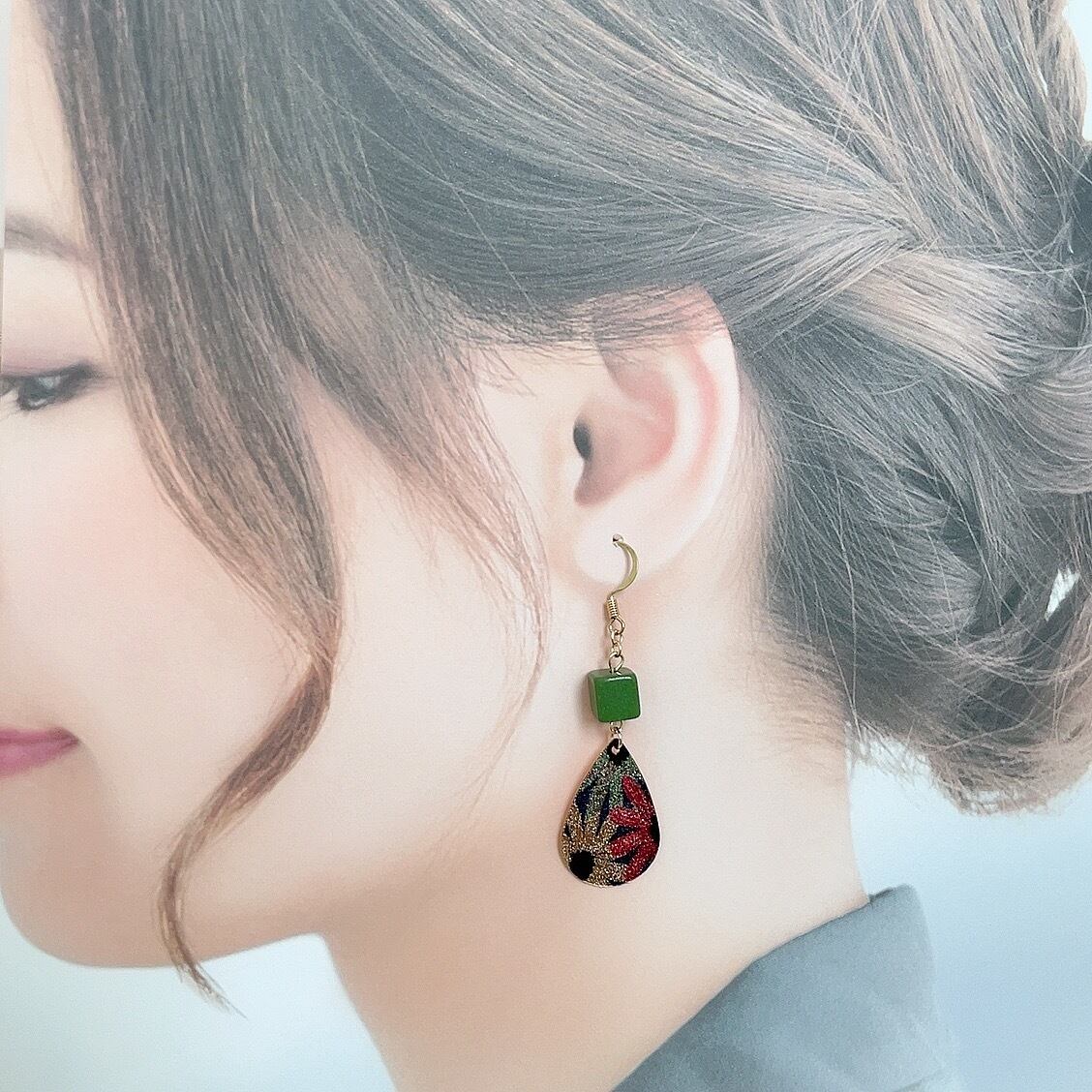 個性的な花柄模様のメタルプレートと四角いフランスビーズのアクセサリー。