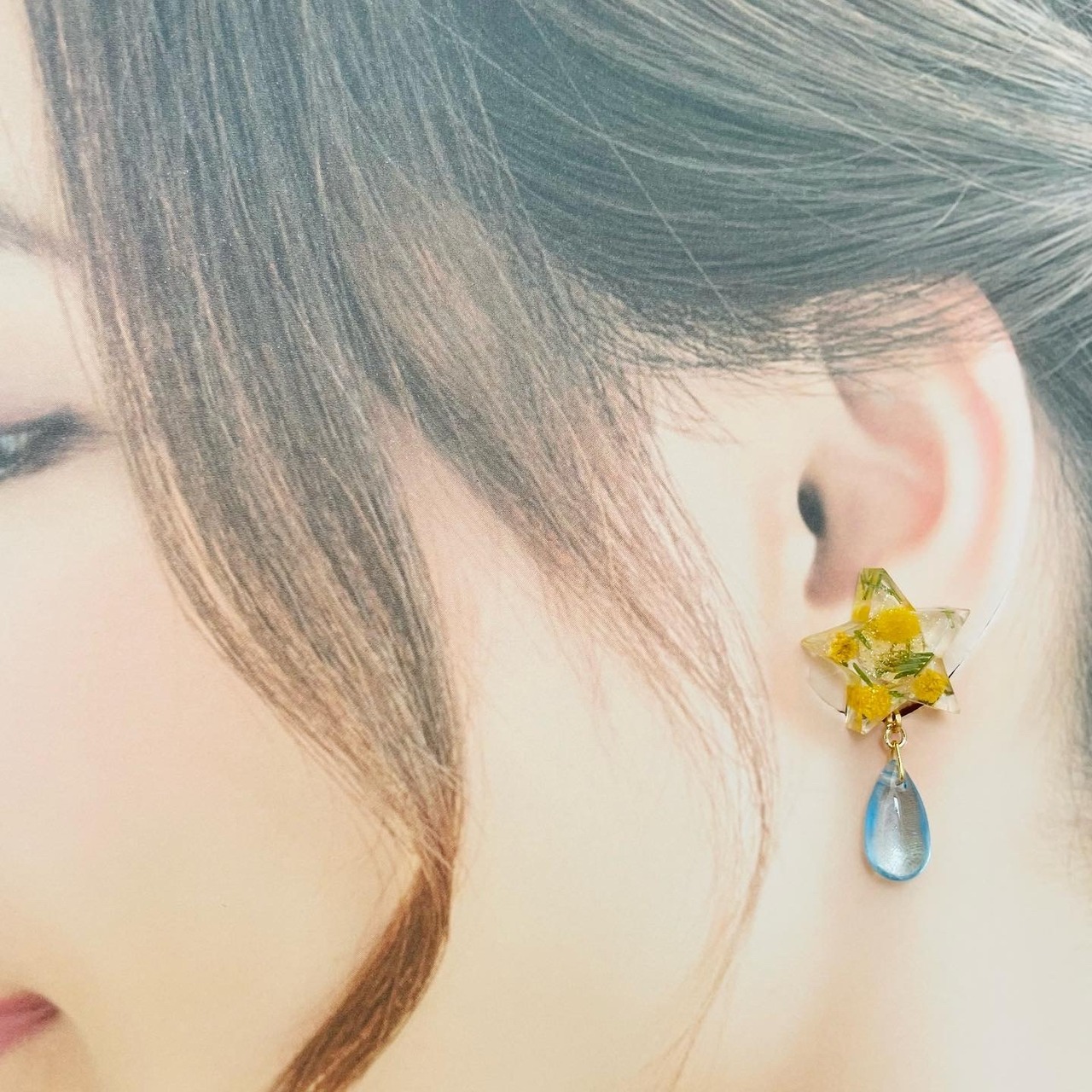 厚みのある星形のレジンにミモザの花や葉を封入したオリジナルカボション。どちらも淡いブルーのしずく形ビーズを揺らしてます。
