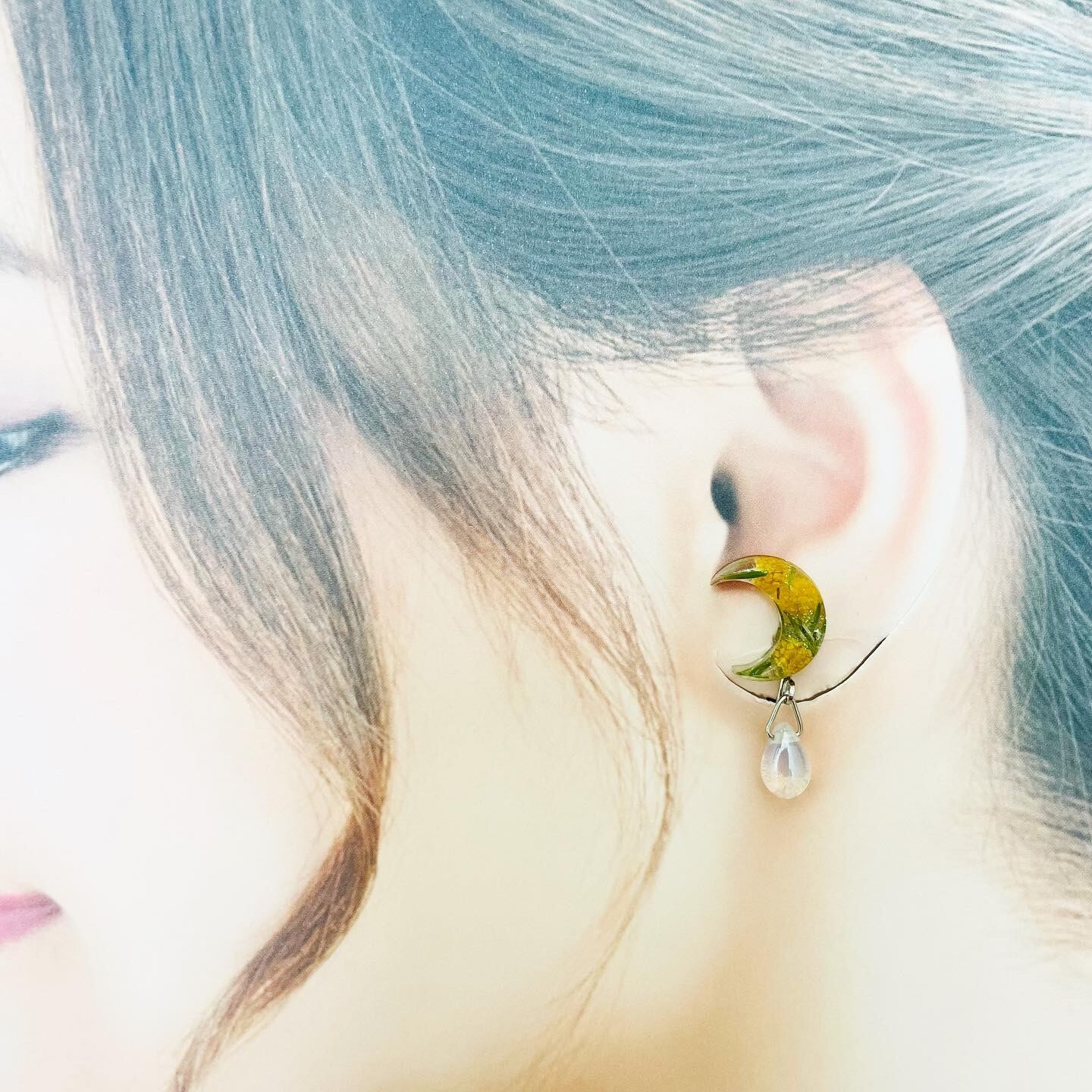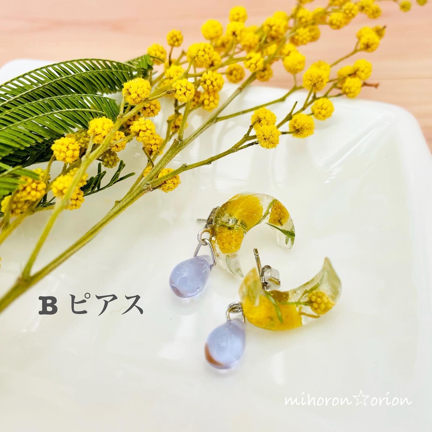 厚みのある月形のレジンにミモザの花や葉を封入したオリジナルカボション。