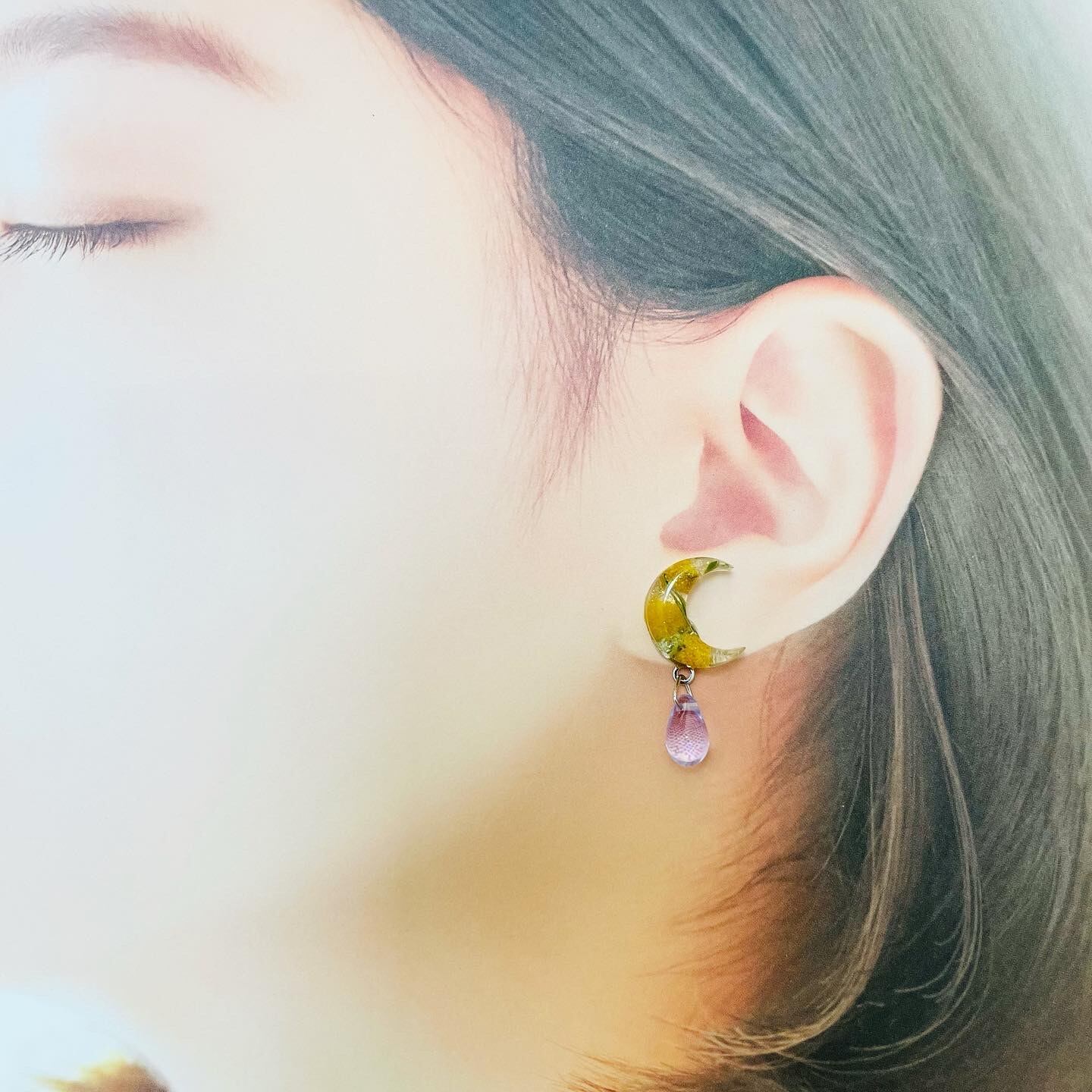 イヤリングは乳白色、ピアスは淡い薄紫のしずく形チェコビーズを揺らしてます。
